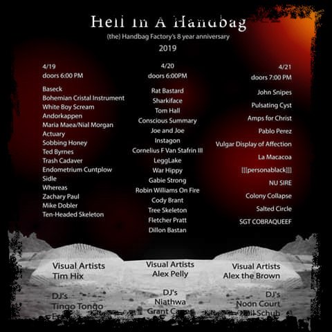 . TOMORROW NIGHT ON FRIDAY 4/19 WE HELP KICK-OFF A SERIES OF SHOWS THAT WILL MAKE YOU SWEAT IN CELEBRATION OF 8 YEARS OF THE HANDBAG FACTORY…… ACTUARY WILL PAY A HEAVY HOMAGE THE ONLY WAY WE KNOW HOW: LOUD AND SONICALLY SINISTER…… DON’T MISS OUT, IT’LL BE HOT LIKE POP TARTS!